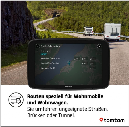 - Das TomTom GO Camper Max-Navigationsgerät bietet spezifische Routen für Wohnmobile, Wohnwagen und Pkw, damit Sie niedrige Brücken und schmale Straßen auf Ihrer Route vermeiden können